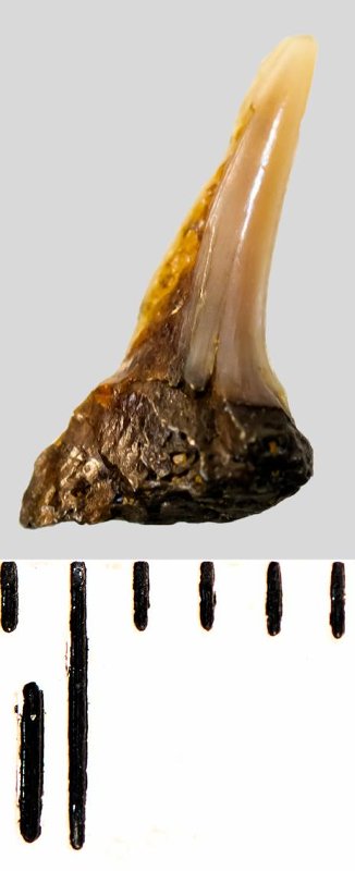 Зуб. Акула. Eostriatolamia subulata (Agassiz, 1843). Классификация: Хордовые Chordata, Позвоночные Vertebrata, Хрящевые рыбы Chondrichthyes, Пластиножаберные Elasmobranchii, Акулы Selachii, Ламнообразные Lamniformes, Песчаные акулы Odontaspididae