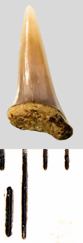 Зуб. Акула. Eostriatolamia subulata (Agassiz, 1843). Классификация: Хордовые Chordata, Позвоночные Vertebrata, Хрящевые рыбы Chondrichthyes, Пластиножаберные Elasmobranchii, Акулы Selachii, Ламнообразные Lamniformes, Песчаные акулы Odontaspididae