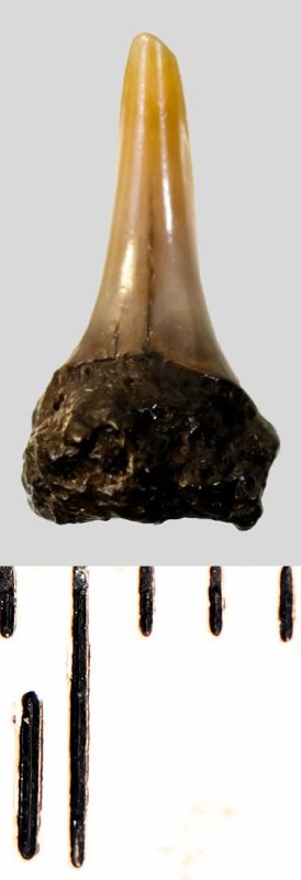 Зуб. Акула. Eostriatolamia subulata (Agassiz, 1843). Классификация: Хордовые Chordata, Позвоночные Vertebrata, Хрящевые рыбы Chondrichthyes, Пластиножаберные Elasmobranchii, Акулы Selachii, Ламнообразные Lamniformes, Песчаные акулы Odontaspididae