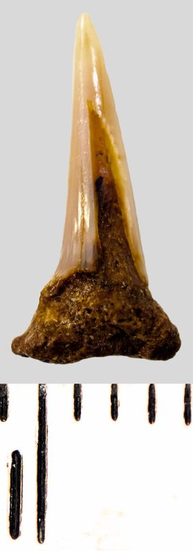 Зуб. Акула. Eostriatolamia subulata (Agassiz, 1843). Классификация: Хордовые Chordata, Позвоночные Vertebrata, Хрящевые рыбы Chondrichthyes, Пластиножаберные Elasmobranchii, Акулы Selachii, Ламнообразные Lamniformes, Песчаные акулы Odontaspididae
