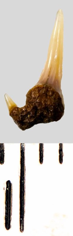 Коронка мелкого бокового зуба коричневого цвета, колюще-режущего типа, S-образно изогнутой, с гладким режущим краем. С лингвальной стороны у основания коронки на эмали имеется скульптура в виде слабой продольной струйчатости. Корень бурый, сохранился фрагментарно.