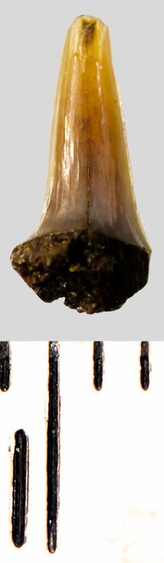 Зуб. Акула. Eostriatolamia subulata (Agassiz, 1843). Классификация: Хордовые Chordata, Позвоночные Vertebrata, Хрящевые рыбы Chondrichthyes, Пластиножаберные Elasmobranchii, Акулы Selachii, Ламнообразные Lamniformes, Песчаные акулы Odontaspididae