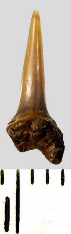Мелкий боковой зуб с коронкой рыжевато-бежевого цвета, колюще-режущего типа, S-образно изогнутой, с гладким режущим краем. С лингвальной стороны у основания коронки на эмали имеется скульптура в виде слабой продольной струйчатости. Корень бурый, арочный, умеренно массивный, со следами окатанности, левая ветвь утрачена. Имеется одна питательная борозда с лингвальной стороны корня. Добавочные зубцы коронки зуба отсутствуют.