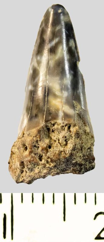 Зуб (фрагмент). Акула. Otodus subserratus (Agassiz, 1843). Классификация: Хордовые Chordata, Позвоночные Vertebrata, Хрящевые рыбы Chondrichthyes, Пластиножаберные Elasmobranchii