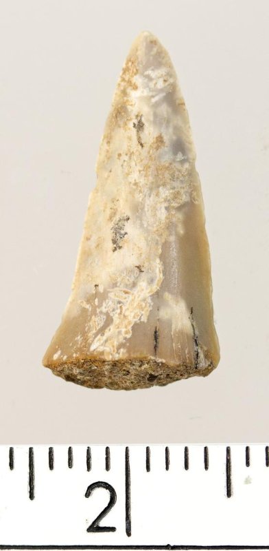 Зуб (фрагмент). Акула. Striatolamia macrota (Agassiz,1843). Классификация: Хордовые Chordata, Позвоночные Vertebrata, Хрящевые рыбы Chondrichthyes, Пластиножаберные Elasmobranchii
