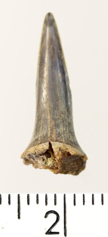 Зуб (фрагмент). Акула. Hypotodus sp. Классификация: Хордовые Chordata, Позвоночные Vertebrata, Хрящевые рыбы Chondrichthyes, Пластиножаберные Elasmobranchii