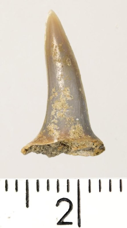 Зуб (фрагмент). Акула. Hypotodus sp. Классификация: Хордовые Chordata, Позвоночные Vertebrata, Хрящевые рыбы Chondrichthyes, Пластиножаберные Elasmobranchii