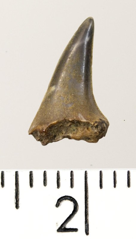 Зуб (фрагмент). Акула. Hypotodus sp. Классификация: Хордовые Chordata, Позвоночные Vertebrata, Хрящевые рыбы Chondrichthyes, Пластиножаберные Elasmobranchii