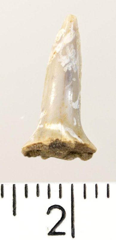 Зуб (фрагмент). Акула. Hypotodus sp. Классификация: Хордовые Chordata, Позвоночные Vertebrata, Хрящевые рыбы Chondrichthyes, Пластиножаберные Elasmobranchii