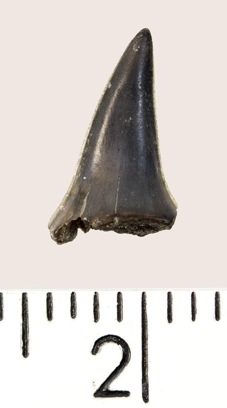 Зуб (фрагмент). Акула. Hypotodus sp. Классификация: Хордовые Chordata, Позвоночные Vertebrata, Хрящевые рыбы Chondrichthyes, Пластиножаберные Elasmobranchii