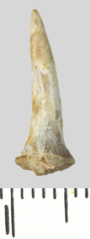 Зуб (фрагмент). Акула. Lamniformes gen. et sp. indet. Классификация: Хордовые Chordata, Позвоночные Vertebrata, Хрящевые рыбы Chondrichthyes, Пластиножаберные Elasmobranchii