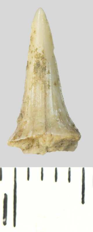 Зуб (фрагмент). Акула. Scapanorhynchus sp. Классификация: Хордовые Chordata, Позвоночные Vertebrata, Хрящевые рыбы Chondrichthyes, Пластиножаберные Elasmobranchii