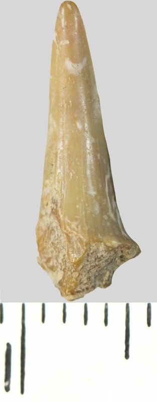 Зуб (фрагмент). Акула. Scapanorhynchus sp. Классификация: Хордовые Chordata, Позвоночные Vertebrata, Хрящевые рыбы Chondrichthyes, Пластиножаберные Elasmobranchii
