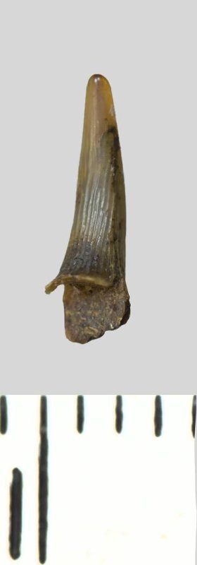 Зуб (фрагмент). Акула. Scapanorhynchus sp. Классификация: Хордовые Chordata, Позвоночные Vertebrata, Хрящевые рыбы Chondrichthyes, Пластиножаберные Elasmobranchii