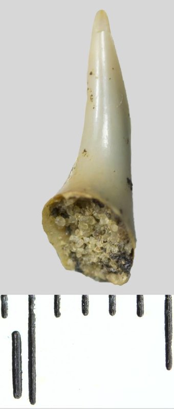 Зуб (фрагмент). Акула. Lamniformes gen. et sp. indet. Классификация: Хордовые Chordata, Позвоночные Vertebrata, Хрящевые рыбы Chondrichthyes, Пластиножаберные Elasmobranchii