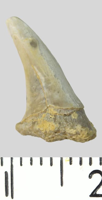 Зуб (фрагмент). Акула. Lamniformes gen. et sp. indet. Классификация: Хордовые Chordata, Позвоночные Vertebrata, Хрящевые рыбы Chondrichthyes, Пластиножаберные Elasmobranchii
