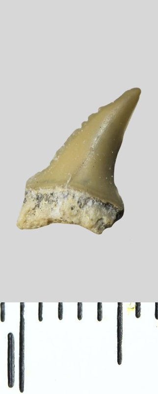 Зуб (фрагмент). Акула. Eostriatolamia sp. Классификация: Хордовые Chordata, Позвоночные Vertebrata, Хрящевые рыбы Chondrichthyes, Пластиножаберные Elasmobranchii
