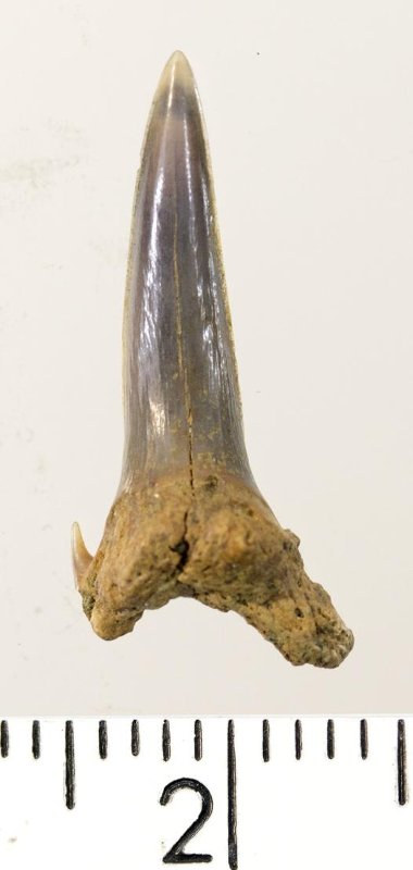 Зуб. Акула. Striatolamia elegans (Agassiz, 1838). Классификация: Хордовые Chordata, Позвоночные Vertebrata, Хрящевые рыбы Chondrichthyes, Пластиножаберные Elasmobranchii