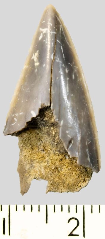 Зуб (фрагмент). Акула. Otodus subserratus (Agassiz, 1843). Классификация: Хордовые Chordata, Позвоночные Vertebrata, Хрящевые рыбы Chondrichthyes, Пластиножаберные Elasmobranchii
