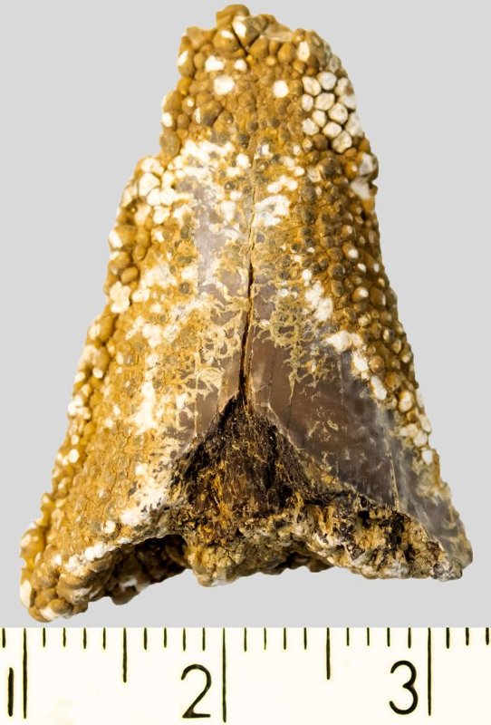 Зуб (фрагмент). Акула. Otodus subserratus (Agassiz, 1843). Классификация: Хордовые Chordata, Позвоночные Vertebrata, Хрящевые рыбы Chondrichthyes, Пластиножаберные Elasmobranchii