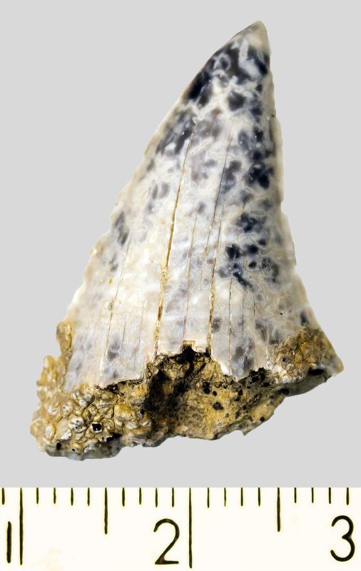 Зуб (фрагмент). Акула. Otodus subserratus (Agassiz, 1843). Классификация: Хордовые Chordata, Позвоночные Vertebrata, Хрящевые рыбы Chondrichthyes, Пластиножаберные Elasmobranchii