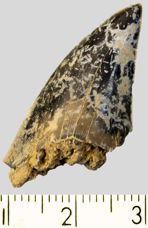 Зуб (фрагмент). Акула. Otodus subserratus (Agassiz, 1843). Классификация: Хордовые Chordata, Позвоночные Vertebrata, Хрящевые рыбы Chondrichthyes, Пластиножаберные Elasmobranchii