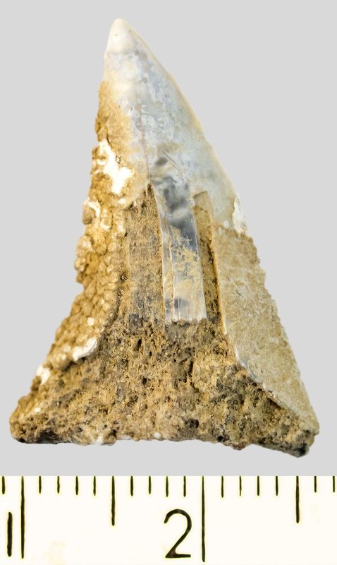 Зуб (фрагмент). Акула. Otodus subserratus (Agassiz, 1843). Классификация: Хордовые Chordata, Позвоночные Vertebrata, Хрящевые рыбы Chondrichthyes, Пластиножаберные Elasmobranchii