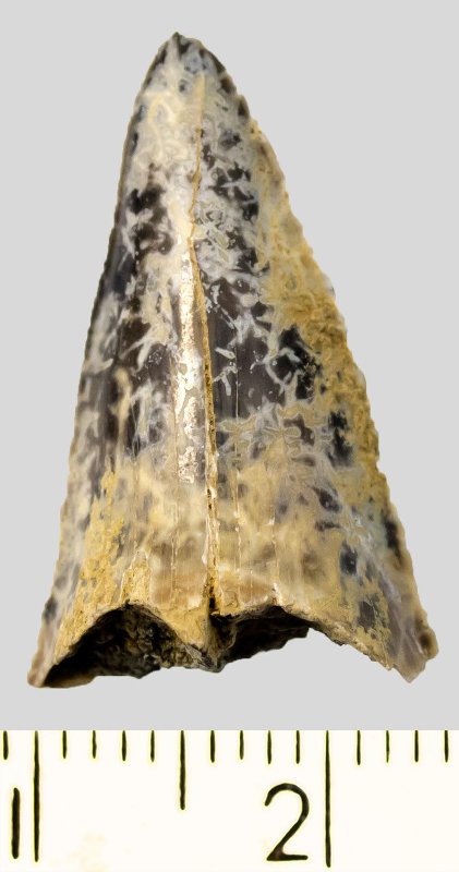 Зуб (фрагмент). Акула. Otodus subserratus (Agassiz, 1843). Классификация: Хордовые Chordata, Позвоночные Vertebrata, Хрящевые рыбы Chondrichthyes, Пластиножаберные Elasmobranchii