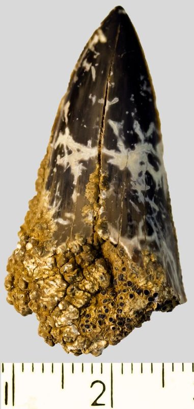 Зуб (фрагмент). Акула. Otodus subserratus (Agassiz, 1843). Классификация: Хордовые Chordata, Позвоночные Vertebrata, Хрящевые рыбы Chondrichthyes, Пластиножаберные Elasmobranchii