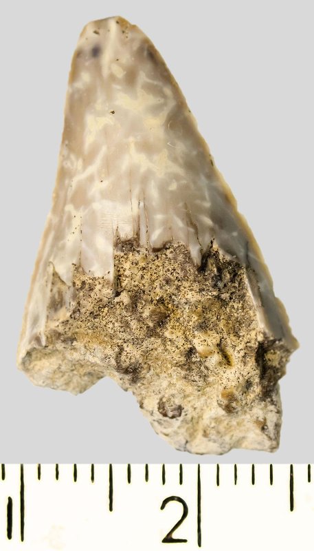 Зуб (фрагмент). Акула. Otodus subserratus (Agassiz, 1843). Классификация: Хордовые Chordata, Позвоночные Vertebrata, Хрящевые рыбы Chondrichthyes, Пластиножаберные Elasmobranchii
