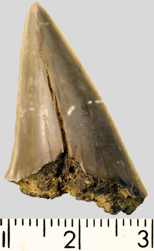 Зуб (фрагмент). Акула. Otodus subserratus (Agassiz, 1843). Классификация: Хордовые Chordata, Позвоночные Vertebrata, Хрящевые рыбы Chondrichthyes, Пластиножаберные Elasmobranchii
