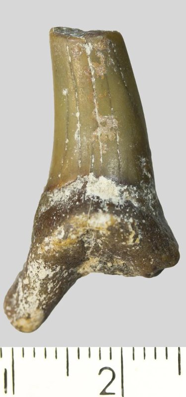 Зуб. Акула. Scapanorhynchus gigas Woodward, 1889. Классификация: Хордовые Chordata, Позвоночные Vertebrata, Хрящевые рыбы Chondrichthyes, Пластиножаберные Elasmobranchii