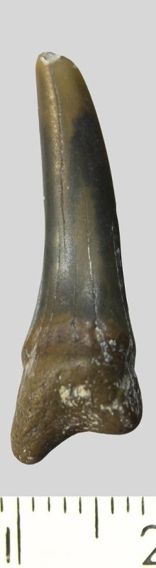 Зуб. Акула. Scapanorhynchus gigas Woodward, 1889. Классификация: Хордовые Chordata, Позвоночные Vertebrata, Хрящевые рыбы Chondrichthyes, Пластиножаберные Elasmobranchii