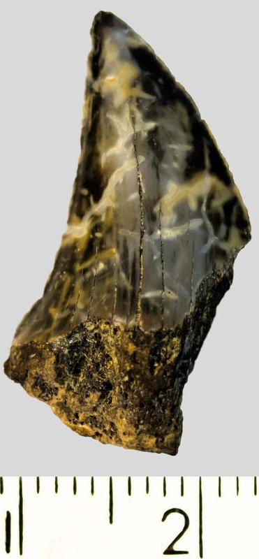 Зуб (фрагмент). Акула. Otodus subserratus (Agassiz, 1843). Классификация: Хордовые Chordata, Позвоночные Vertebrata, Хрящевые рыбы Chondrichthyes, Пластиножаберные Elasmobranchii
