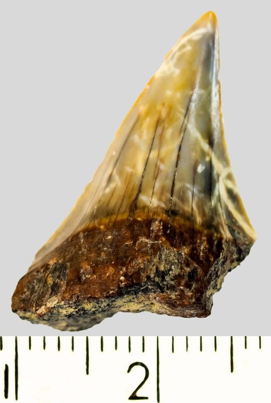 Зуб (фрагмент). Акула. Otodus subserratus (Agassiz, 1843). Классификация: Хордовые Chordata, Позвоночные Vertebrata, Хрящевые рыбы Chondrichthyes, Пластиножаберные Elasmobranchii