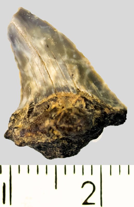 Зуб (фрагмент). Акула. Otodus subserratus (Agassiz, 1843). Классификация: Хордовые Chordata, Позвоночные Vertebrata, Хрящевые рыбы Chondrichthyes, Пластиножаберные Elasmobranchii