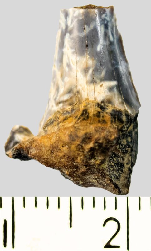 Зуб (фрагмент). Акула. Otodus subserratus (Agassiz, 1843). Классификация: Хордовые Chordata, Позвоночные Vertebrata, Хрящевые рыбы Chondrichthyes, Пластиножаберные Elasmobranchii