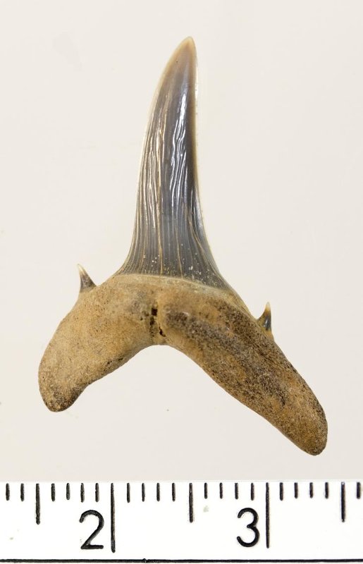 Зуб. Акула. Striatolamia elegans (Agassiz, 1838). Классификация: Хордовые Chordata, Позвоночные Vertebrata, Хрящевые рыбы Chondrichthyes, Пластиножаберные Elasmobranchii