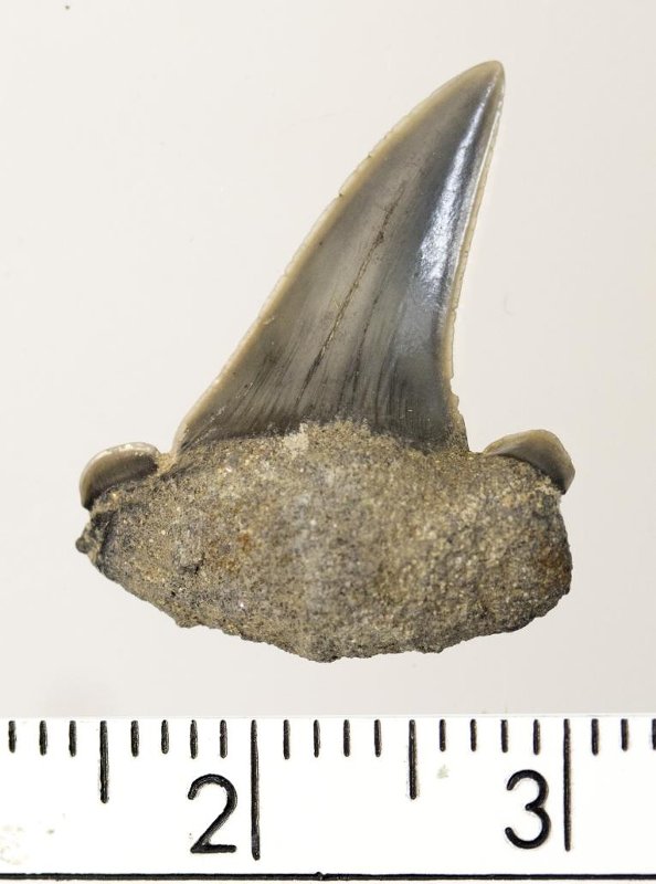 Зуб. Акула. Striatolamia macrota (Agassiz,1843). Классификация: Хордовые Chordata, Позвоночные Vertebrata, Хрящевые рыбы Chondrichthyes, Пластиножаберные Elasmobranchii