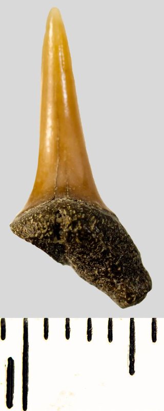Мелкий боковой зуб с коронкой рыжевато-бежевого цвета, колюще-режущего типа, S-образно изогнутой, с гладким режущим краем. С лингвальной стороны у основания коронки на эмали имеется скульптура в виде слабой продольной струйчатости. Корень бурый, арочный, умеренно массивный, со следами окатанности, левая ветвь утрачена. Имеется одна питательная борозда с лингвальной стороны корня. Добавочные зубцы коронки зуба отсутствуют.