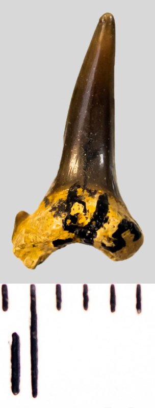 Мелкий боковой зуб с коронкой бурого цвета, режущего типа, S-образно изогнутой, с гладким режущим краем. Корень охристый, арочный, умеренно массивный, со следами окатанности и мелкими сколами. С лингвальной стороны корня питательная борозда. Имелась одна пара добавочных зубцов коронки, сохранился только левый.