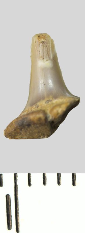 Зуб (фрагмент). Акула. Odontaspis striatula Dalinkevicius, 1935. Классификация: Хордовые Chordata, Позвоночные Vertebrata, Хрящевые рыбы Chondrichthyes, Пластиножаберные Elasmobranchii