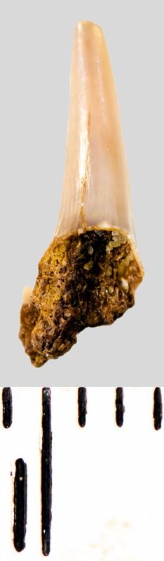 Зуб. Акула. Eostriatolamia subulata (Agassiz, 1843). Классификация: Хордовые Chordata, Позвоночные Vertebrata, Хрящевые рыбы Chondrichthyes, Пластиножаберные Elasmobranchii, Акулы Selachii, Ламнообразные Lamniformes, Песчаные акулы Odontaspididae