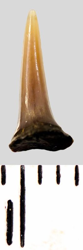 Зуб. Акула. Eostriatolamia subulata (Agassiz, 1843). Классификация: Хордовые Chordata, Позвоночные Vertebrata, Хрящевые рыбы Chondrichthyes, Пластиножаберные Elasmobranchii, Акулы Selachii, Ламнообразные Lamniformes, Песчаные акулы Odontaspididae