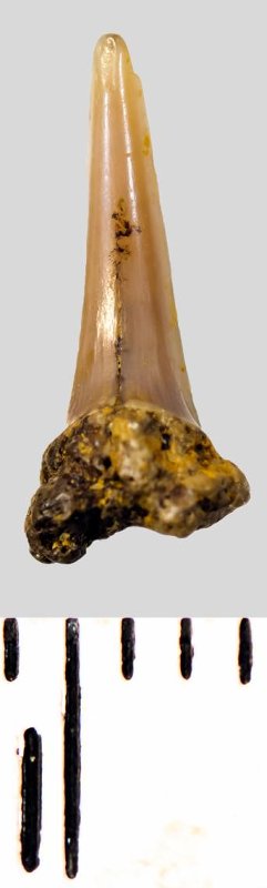 Зуб. Акула. Eostriatolamia subulata (Agassiz, 1843). Классификация: Хордовые Chordata, Позвоночные Vertebrata, Хрящевые рыбы Chondrichthyes, Пластиножаберные Elasmobranchii, Акулы Selachii, Ламнообразные Lamniformes, Песчаные акулы Odontaspididae