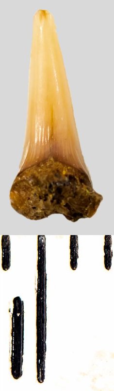 Зуб. Акула. Eostriatolamia subulata (Agassiz, 1843). Классификация: Хордовые Chordata, Позвоночные Vertebrata, Хрящевые рыбы Chondrichthyes, Пластиножаберные Elasmobranchii, Акулы Selachii, Ламнообразные Lamniformes, Песчаные акулы Odontaspididae