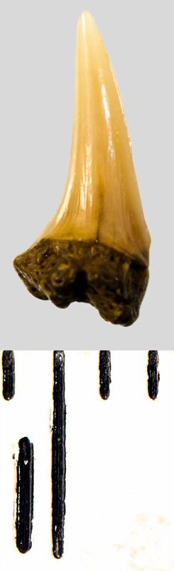Зуб. Акула. Eostriatolamia subulata (Agassiz, 1843). Классификация: Хордовые Chordata, Позвоночные Vertebrata, Хрящевые рыбы Chondrichthyes, Пластиножаберные Elasmobranchii, Акулы Selachii, Ламнообразные Lamniformes, Песчаные акулы Odontaspididae