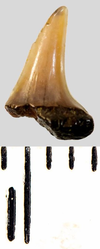 Зуб. Акула. Eostriatolamia subulata (Agassiz, 1843). Классификация: Хордовые Chordata, Позвоночные Vertebrata, Хрящевые рыбы Chondrichthyes, Пластиножаберные Elasmobranchii, Акулы Selachii, Ламнообразные Lamniformes, Песчаные акулы Odontaspididae