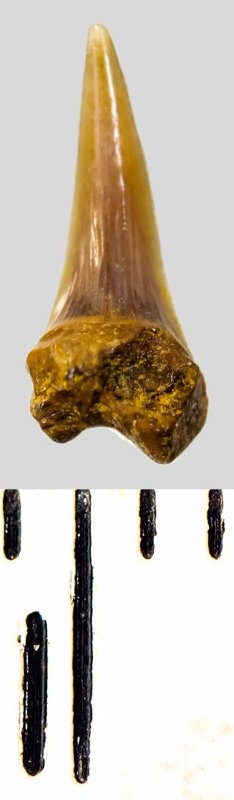 Зуб. Акула. Eostriatolamia subulata (Agassiz, 1843). Классификация: Хордовые Chordata, Позвоночные Vertebrata, Хрящевые рыбы Chondrichthyes, Пластиножаберные Elasmobranchii, Акулы Selachii, Ламнообразные Lamniformes, Песчаные акулы Odontaspididae