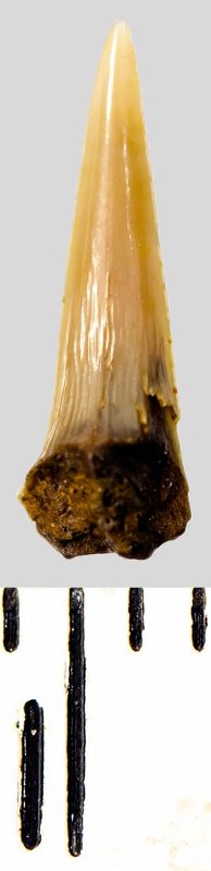 Зуб. Акула. Eostriatolamia subulata (Agassiz, 1843). Классификация: Хордовые Chordata, Позвоночные Vertebrata, Хрящевые рыбы Chondrichthyes, Пластиножаберные Elasmobranchii, Акулы Selachii, Ламнообразные Lamniformes, Песчаные акулы Odontaspididae
